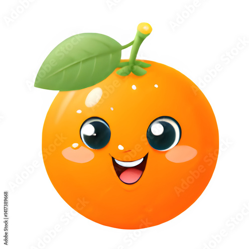 © Saima, Obraz premium This image features a cheerful cartoon orange character with big, friendly eyes and a wide smile. It has a small green leaf and stem sticking out from the top.