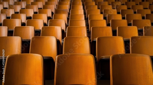 © nattapon, Fototapeta premium This image features a close-up view of neatly arranged wooden chairs in a large auditorium, ideal for concepts related to education, presentations, and public speaking settings,