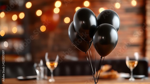 © Freshpixel, Naklejka premium This image features a cluster of black balloons artistically arranged on a wooden table, creating an elegant atmosphere suitable for celebration or partying.