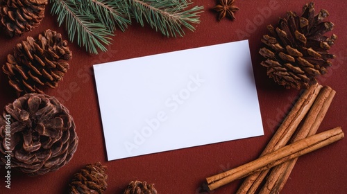 © NeuralStudio, Fototapeta premium This image features a festive arrangement of pine cones, cinnamon sticks, and evergreen branches on a warm red background, ready for a holiday message.
