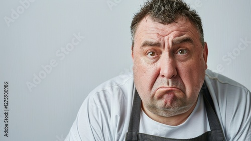 Fototapeta premium This image features a man wearing an apron, looking exasperated or confused.
