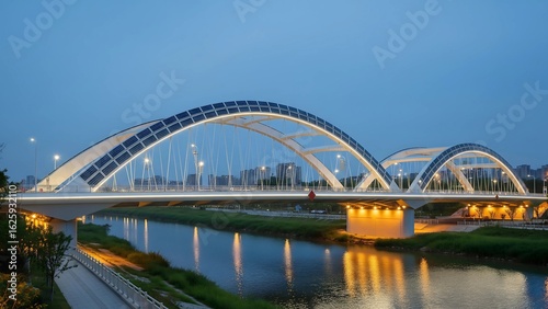 Fototapeta premium This image features a modern bridge with a solar panel arch and elegant lighting, spanning a river at dusk, symbolizing sustainable urban infrastructure and smart city design.