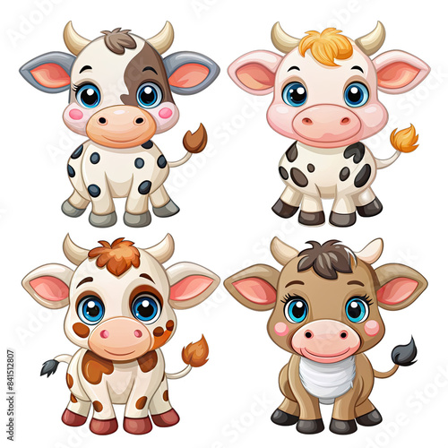 Fototapeta premium This image features a set of four adorable baby cow cartoons, each with...