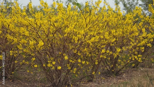Fototapeta premium This image features a vibrant yellow flowering bush with lush foliage. The...
