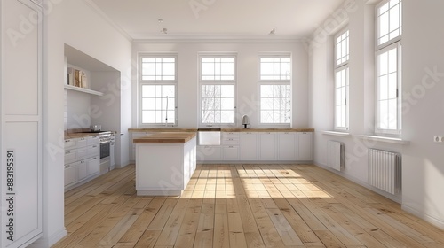 Naklejka premium This image highlights an airy white kitchen featuring a central island and plenty of sunlight pouring in through large windows, presenting a clean and fresh space with a contemporary aesthetic.