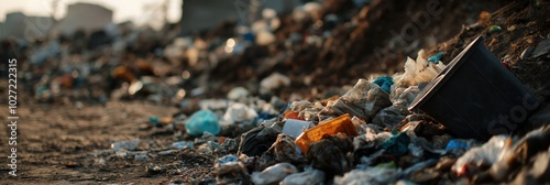Fototapeta premium This image highlights an urban landfill filled with diverse waste, reflecting...
