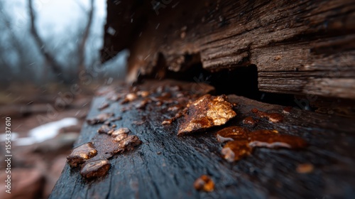 Fototapeta premium This image illustrates a rustic wooden surface adorned with golden honey droplets that capture the essence of natural sweetness and enriching textures in a beautifully blurred background.