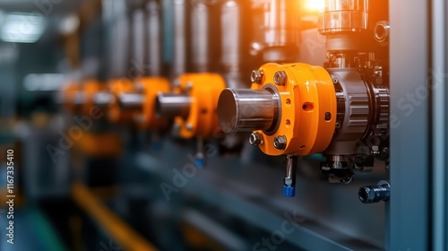 © JoxyAimages, Obraz premium This image presents a row of colorful industrial machines highlighted in orange, symbolizing efficiency and innovation in manufacturing, reflecting modern design and technology.