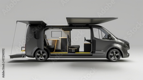 © Prostock-studio, Obraz premium This image showcases a black camper van with its awning extended, revealing the interior with comfortable seating, a small table, and a bed.