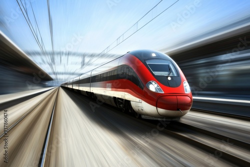 Fototapeta premium This image showcases a high-speed train in rapid motion, racing along the...