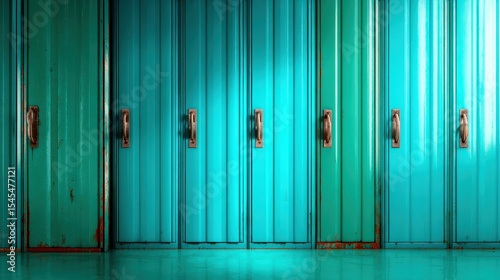 Fototapeta premium This image showcases a series of vibrant turquoise school lockers,...