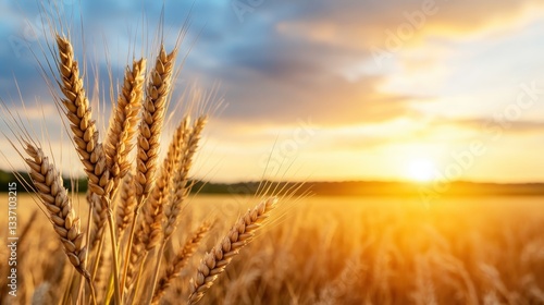 Fototapeta premium This image showcases a stunning golden wheat field under a vibrant sunset,...