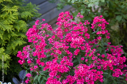 © juriskraulis, Fototapeta premium This image showcases a vibrant cluster of pink phlox flowers in full bloom, surrounded by lush green foliage.