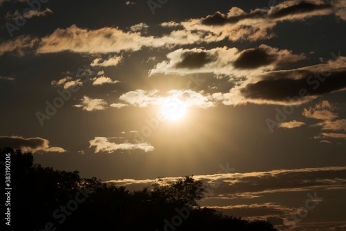 Obraz premium This image shows a dramatic sun setting amongst a cloudy sky.