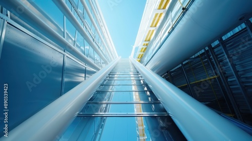 Obraz premium This image shows a modern architectural structure captured from a ground perspective, emphasizing its sleek lines, reflective surfaces, and contemporary style reaching up toward the sky.
