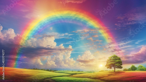 Obraz premium This image shows a rainbow over a field of red and yellow flowers