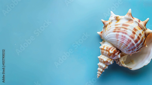 © Elnare, Obraz premium This image shows a seashell on a blue background. The seashell is a conch shell, and it is white and brown in color.