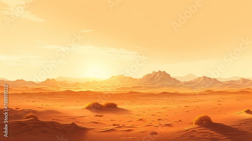 © BozStock, Naklejka premium This is a beautiful landscape of a desert with mountains in the distance. The warm colors of the sand and sky create a peaceful and serene scene.