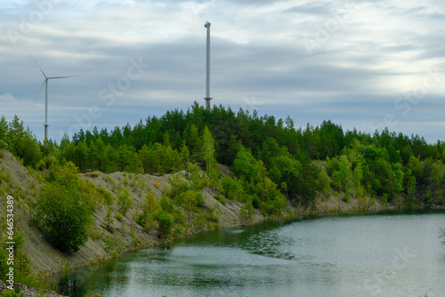 © Sandris Veveris, Obraz premium This is a former shale quarry with azure water and picturesque hills. Unlike the Narva shale settling ponds. A dark autumn day. Estonia, Aidu quarry. A tall wind turbine in the distance