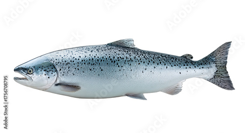Naklejka premium This is a fresh Atlantic salmon fish with a silver body and black spots, representing a nutritious seafood option.