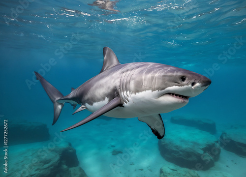 © Muntaha Studio, Naklejka premium This is a horizontal underwater shot of a Great White Shark swimming just below the surface