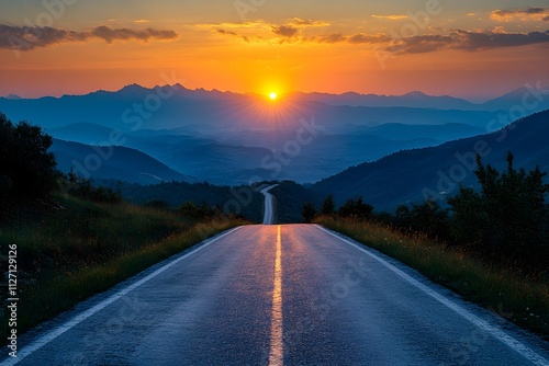 © AI Digital Artist, Fototapeta premium This is a landscape photo showing a beautiful and emotional red sunset with a road over a hill and mountains in the distance.