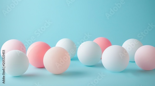 © Galib, Fototapeta premium This is a photograph of a group of pastel-colored balls on a blue background.
