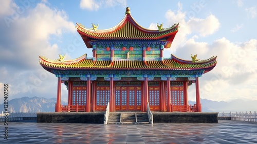 © Elkhan Babayev, Obraz premium This is a picture of a Chinese-style building. It has a colorful roof and walls. It looks like a temple or a pagoda.