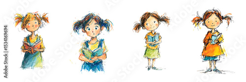 Fototapeta premium this is an illustration featuring seven animated figures, which appear to be children standing in a row. they are depicted in a simplistic style with limited detail, characteristic of many cartoons