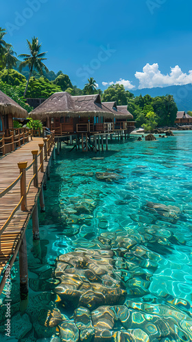 © Akharadat, Obraz premium This is an image of a beach resort with thatched huts and a dock in the water, on a sunny day, houses on stilts, waterfront houses, paradise in the background, 8K
