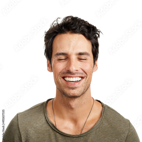 Obraz premium This is funny. A handsome young man smiling with his eyes closed.
