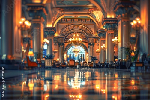 © Halina Berah, Obraz premium This is the lobby of a luxury hotel with carpets, furniture, and large pillars.