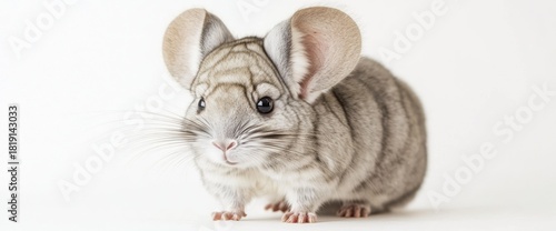 © Vitalii Shkurko, Obraz premium This light grey chinchilla stands against a white background, displaying its fluffy coat and bright eyes. A close-up captures the animal's playful demeanor and adorable features