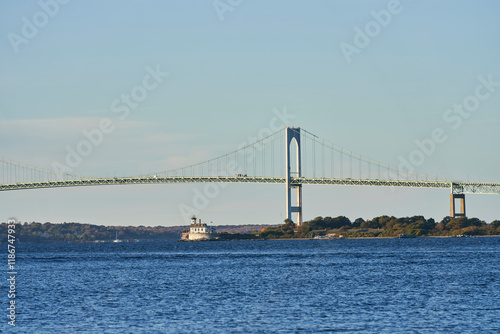 © Daniel, Naklejka premium This little white light house is located on Rose Island near Newport Rhode Island. In the background is Claiborne Pell Newport Bridge