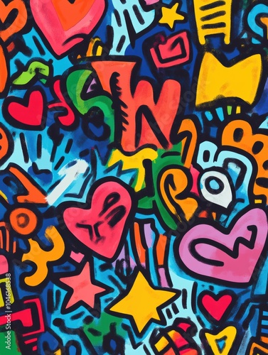 © Anat art, Naklejka premium This lively doodle features a mix of vibrant icons including stars, hearts, and arrows, creating an energetic atmosphere of playful creativity. Generative AI
