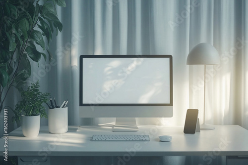 © GraphixStudio, Obraz premium This minimalist desk setup showcases a desktop computer surrounded by greenery for a nature-inspired work environment