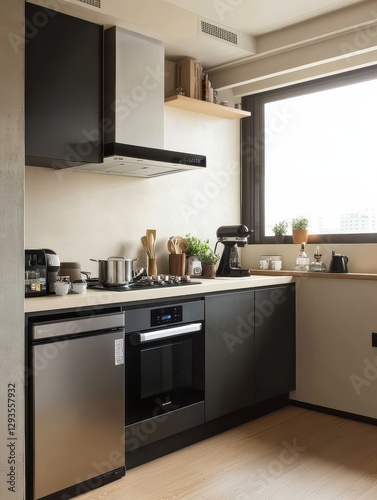 Fototapeta premium This minimalist kitchen features an aesthetic with modern appliances