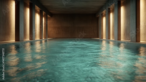 Fototapeta premium This modern indoor pool exhibits tranquil water reflections under subtle...