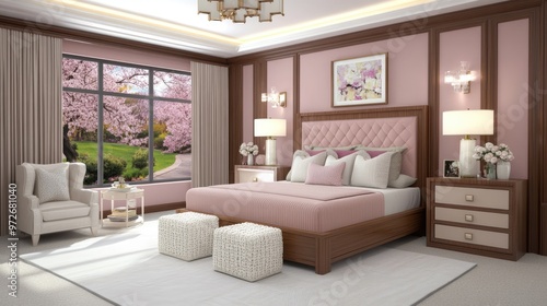 © lililia, Fototapeta premium This pink bedroom features wooden elements, large windows overlooking cherry blossom trees, and cozy seating, creating a tranquil atmosphere perfect for relaxation