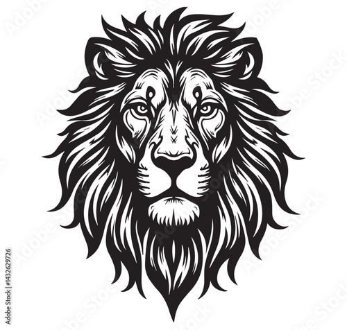 © Jotish, Fototapeta premium This powerful illustration captures the noble essence of a lion through bold, black vector lines against a white background. The lion's mane flows outward in sharp, stylized strands,
