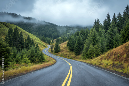 © Phichitpon, Fototapeta premium This serene aerial view captures a winding road cutting through a dense, lush evergreen forest enveloped in gentle mist, offering tranquility.