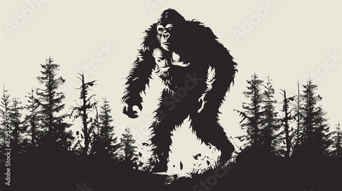 Fototapeta premium This striking black and white illustration shows a colossal Bigfoot emerging...