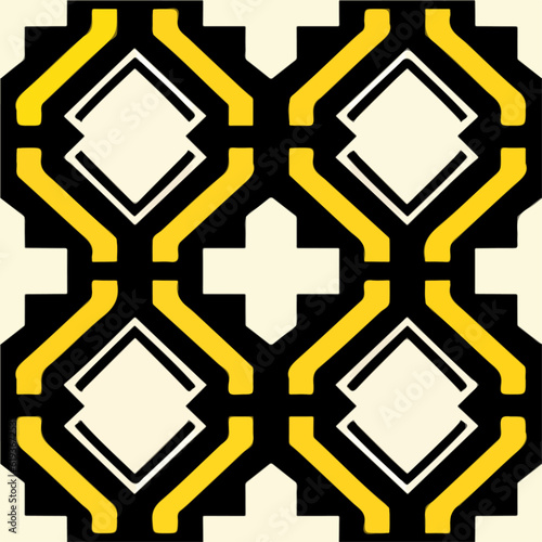 © Issah, Fototapeta premium This striking black and yellow pattern on a white background features an art deco and Shipibo influence, creating a captivating and symmetric design.