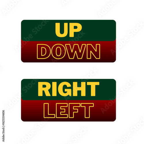© Aamir, Fototapeta premium This striking close-up showcases a visually compelling sign, featuring bold text that reads "UP DOWN RIGHT LEFT." The clean design and vivid font make it memorable.