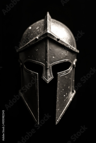 © zamuruev, Obraz premium This striking warriors helmet, adorned with intricate details, evokes the spirit of ancient battles and valor, standing boldly against a black background that enhances its allure