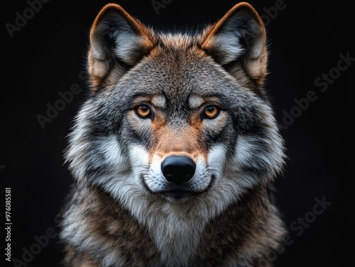 © ChaoticMind, Obraz premium This stunning close-up image captures a wolf's intense gaze against a dark background, highlighting its majestic features and captivating expression.