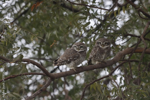 Fototapeta premium This stunning image captures an Indian Owl perched on a tree, blending...