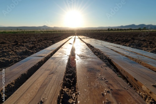 © Milos, Naklejka premium This stunning image captures wooden boards reflecting golden sunlight, symbolizing farming efforts and the beauty of nature at sunrise in an agricultural setting.
