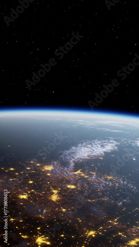 © icetray, Obraz premium This stunning view captures the curvature of Earth from space, highlighting city lights glowing below and clouds drifting in the night sky, creating a breathtaking contrast against the darkness.