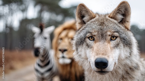 © Pinklife, Fototapeta premium This stunning wildlife photograph captures a close encounter among a wolf, a lion, and a zebra, showcasing the extraordinary beauty and drama of nature's wilderness.
